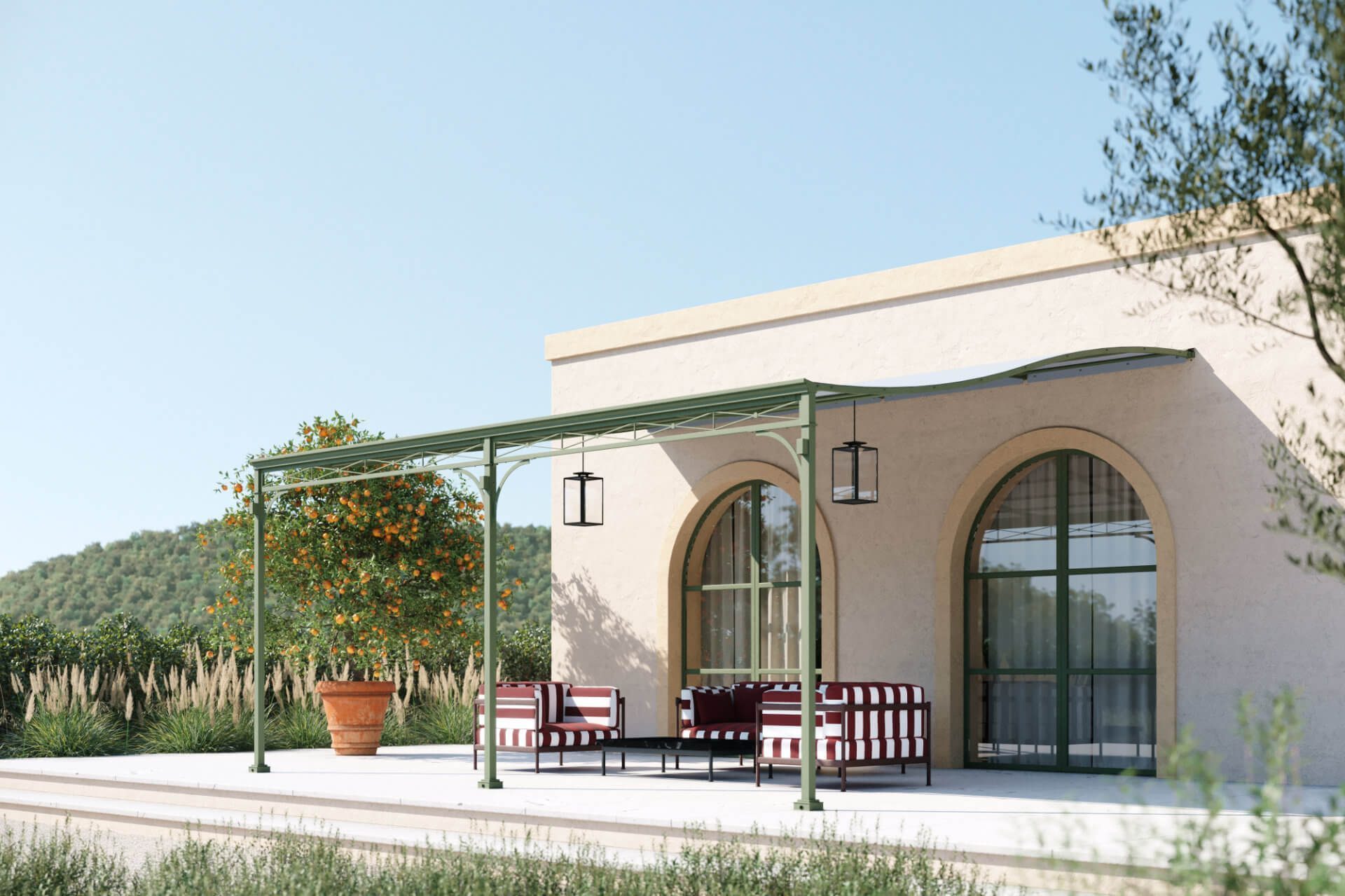 Die Novecento Rain Pergola verbindet die Eleganz der Novecento-Familie mit dem frontalen Regenwassersystem und wird so zu einer natürlichen Erweiterung der Räume, an denen sie angebracht ist.