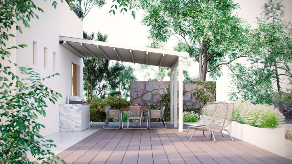 Die Wandpergola Suite von Unosider, ist eine Pergola mit elektrisch fahrbarer Markise. Während Ihre Nachbarn sich noch kurbeln und drehen, drücken Sie entspannt nur auf das Knöpfchen.